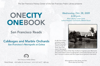 Joining the tour, led by Monica Williams of Holy Cross Cemetery, will be Doug Dorst, author of San Francisco’s One City One Book 2009 selection Alive in Necropolis, a remarkable and original novel set primarily in Colma’s cemeteries. For more information visit SF History Association.